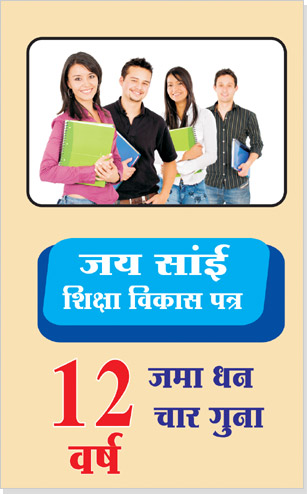 | यह आपके बच्चे के भविष्य की जरूरतों को पूरा करने वाला ट्रेडीशनल "जय सांई शिक्षा विकास पत्र " के माध्यम से इस प्लान में किया गया निवेश आपके बच्चे के जीवन में उस समय काम आता है जब उसको उस निवेश की राशि की जरूरत होती है चाहे व समय बच्चे की शादी का समय हो या फिर उच्च शिक्षा के लिए वह पत्र पूरी तरह से बच्चे के भविष्य को आर्थिक रूप से सुरक्षित करता है! |
